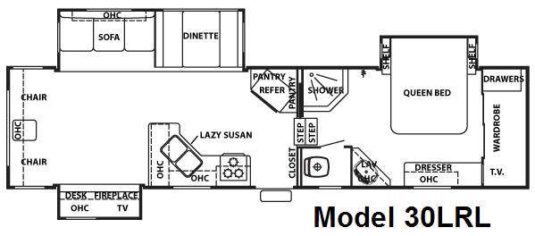 Triple Slide, Rear Living Area w/Easy Chairs, Desk/Fireplace/TV Cabinet Slideout, Sofa/Booth Dinette Slideout, Refrigerator, Pantries, Lazy Susan, Double Kitchen Sink, 3 Burner Range, Angle Shower, Private Toilet Area, Corner Vanity w/Sink & Overhead, Front Queen Bed Slideout w/Shelves, Drawers, Wardrobe, TV Cabinet & Dresser, Overhead Cabinets Throughout, and Much More!