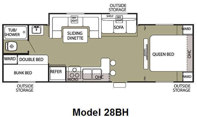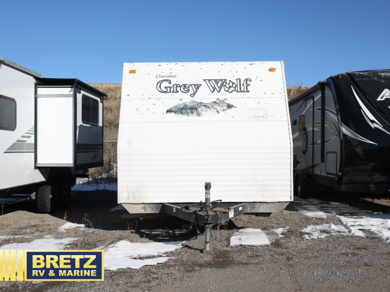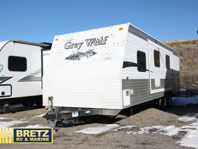 Single Slide Cherokee Grey Wolf Travel Trailer w/Rear Corner Bath, Tub/Shower, Lav., Rear Bunkhouse w/Double Bed & Bunk Above, Wardrobe, Sliding Booth Dinette & Sofa Slideout Both w/Skylights Above, Refrigerator, Double Sink, 3 Burner Range w/Microwave Above, 2 Bar Stools, Front Queen Bed w/Wardrobes, Pass-Thru Storage, Overhead Cabinets & Much More.