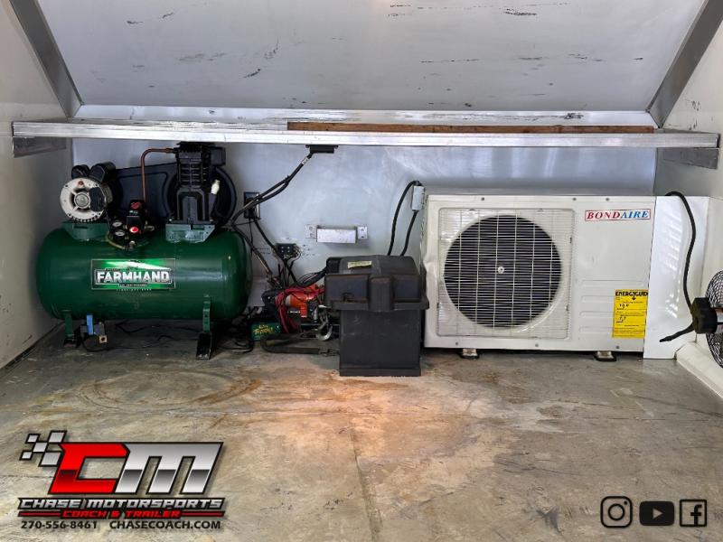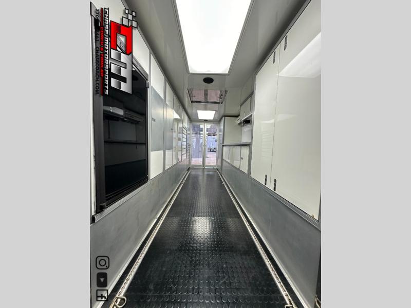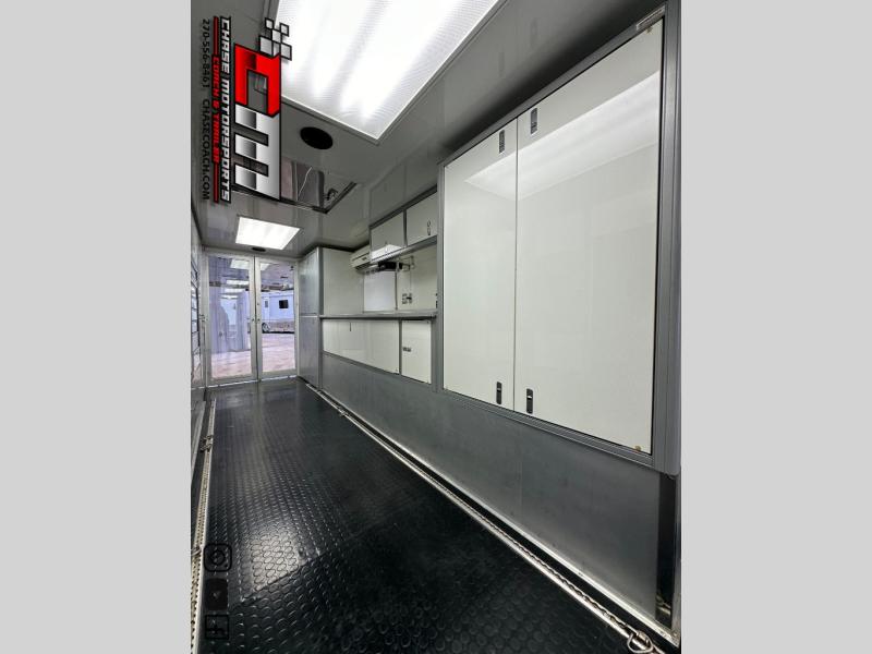 The Trailer is as nice as they come used & loaded up too. 38’ with Hydraulic Liftgate, 55” Upper Deck Height, Dual Tandem 20,000LB Air Ride / Air Brake Axles, Slideout, Walk-On Roof w/Aluminum Access Ladder on Front of Trailer, Dual Air Conditioners w/Heat Pumps, Tire Grooving Station, Rubber Coin Floor, Aluminum Tire Racks, TechnoCraft Aluminum Cabinets w/Toolboxes, Fridge, Winch, Bathroom Package w/Sink & Toilet, Air Compressor, TV, Garage Door in Upper Deck & Sliding Glass Doors w/T-Shirt Displays on the Bottom, Gloss White Exterior w/Polished Stainless Metal Lower Section & Aluminum Trim.