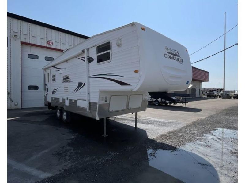 Single Slide Conquest Fifth Wheel w/Rear Living Area, Sofa & Booth Dinette Slideout w/Sofa Storage & Overhead Cabinets, One Standard Lounge Chair & One Optional Chair, Side Table & Overhead Cabinets, Ent. Center, Double Kitchen Sink, 3 Burner Range, Refrigerator, Pantry, Closet w/Double Entrance, Private Toilet Area, Angle Shower, Lav., Front Queen Bed w/Nightstand, Wardrobe & More!