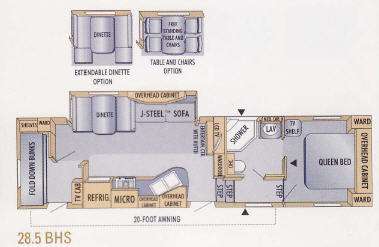 Single Slide Fifth Wheel w/Rear Fold Down Bunks, Shelves, Ward., TV Cab., Booth Dinette & J-Steel Sofa Slide Out or Opt. Extendable Dinette & Free Standing Table & Chairs, Refrig., 3 Burner Range w/Micro., Dbl. Kitchen Sink, Overhead Cabinets, Enter. Cntr. w/Hutch, Ward., Step Bath/Bedroom, Shower, Lav. w/Med. Cab., Toilet, Front Queen Bed w/Dbl. Ward., Overhead Cab., TV Shelf, 20' Awning & More.