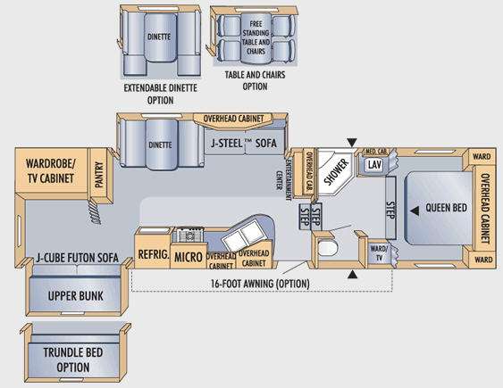 Double Slide Eagle Super Lite Bunkhouse FW w/Wardrobe/TV Cabinet, J-Cube Futon Sofa Slideout w/Bunk Above or Opt. Trundle Bed, Refrig., 3 Burner Range w/Micro., Dbl. Kitchen Sink, Ent. Center, J-Steel Sofa & Booth Dinette Slideout or Extendable Dinette w/Table & Chairs Option, Bath w/Angle Shower, Lav., Med. Cab., Private Toilet Area, Ward./TV, Front Queen Bed w/2 Wardrobes, Overhead Storage, Pass-Thru Storage, Opt. 16' Opt. Awning & Much More.