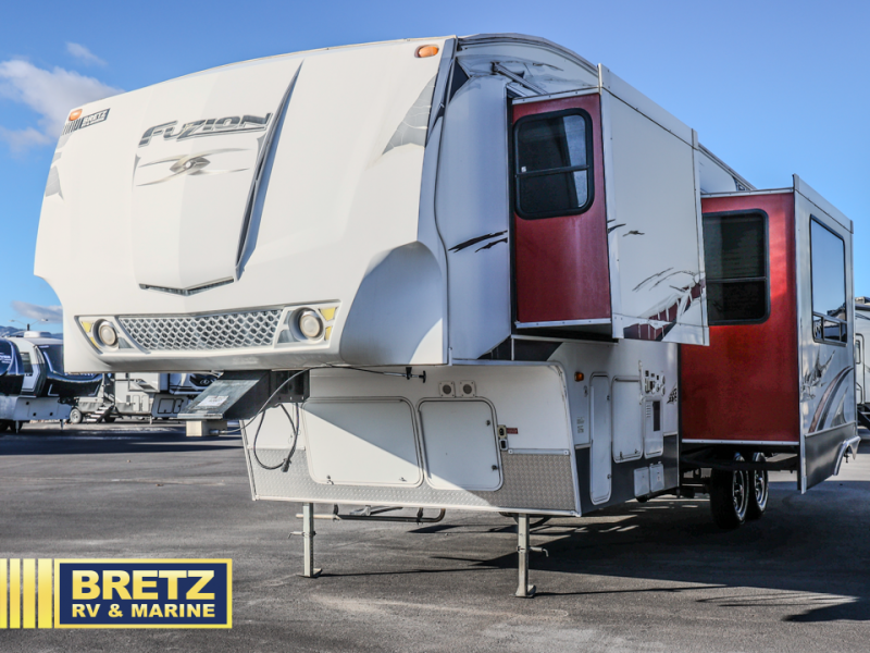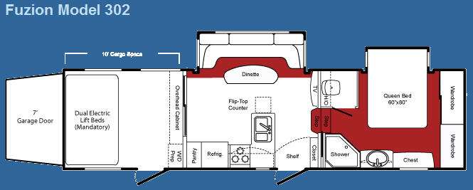 Double Slide Fuzion FW Toy Hauler w/Rear 7' Garage Door to 10' Cargo Area w/Opt. Dual Electric Lift Beds, W/D Prep, Separate Garage Side Door Entry, Overhead Cabinets, Sliding Patio Doors, Pantry, Refrigerator, 3 Burner Range, Double Kitchen Sink w/Flip Top Counter Space, Slideout Dinette Lounge, TV, Closet, Step Up To Bed & Bath w/Private Toilet Area, Angle Shower, Lav., Chest, Pull-Out TV Tray, Wardrobe, Front Queen Bed Slide and More!