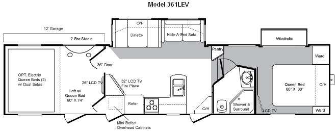 KEYSTONE, RAPTOR, FIFTH WHEEL, TOY HAULERDouble Slide Raptor Toy Hauler FW w/Rear Opt. Electric Queen Beds (2) w/Dual Sofas in 12' Cargo Area, Loft w/Queen Bed Above Cargo, Table w/2 Bar Stools and 26" LCD TV in Cargo Area w/Side Entry Also. Private Side Entry to Mini Refrig. & Overhead Cabinets, 32" LCD TV/Fireplace Below, Refrig., 3 Burner Range, Dbl. Sink, Booth Dinette & Hide-A-Bed Sofa Slide, Bath w/Corner Shower & Surround, Lav. & Toilet, Queen Bed w/Wardrobes w/One Slideout Ward., LCD TV, Overhead Storage and More!
