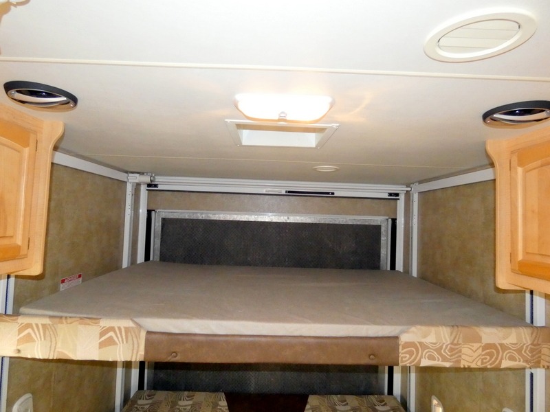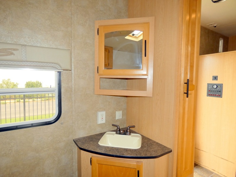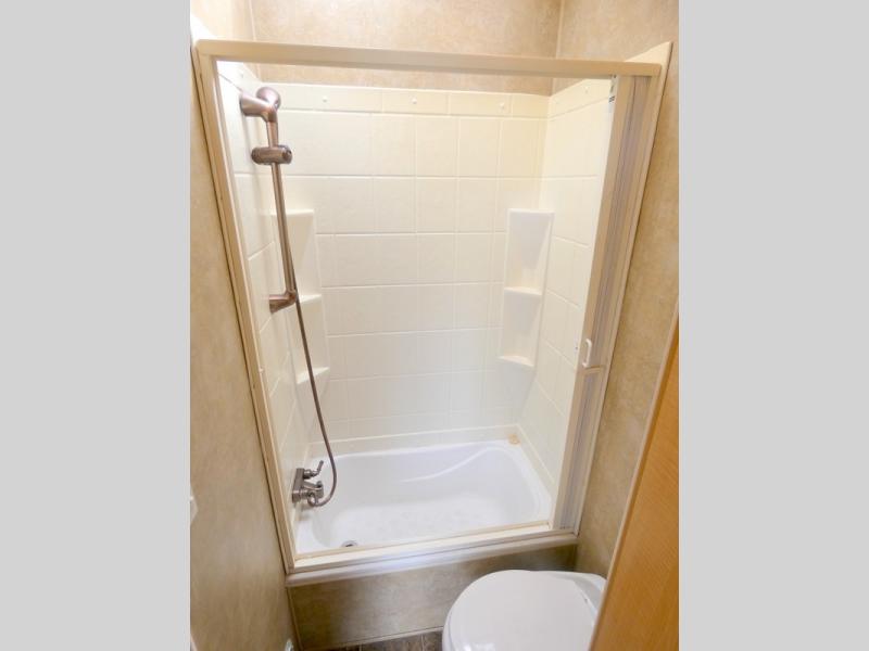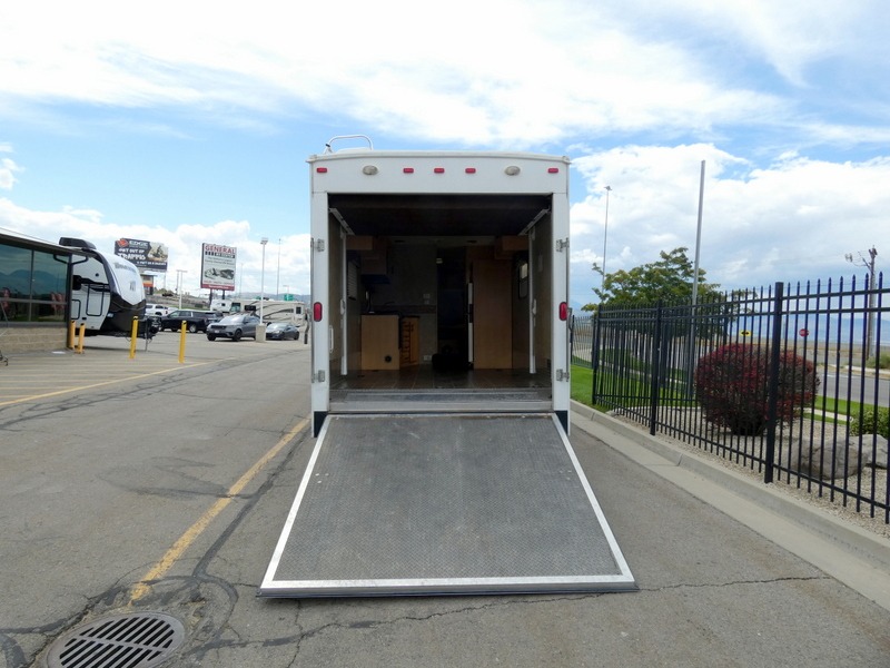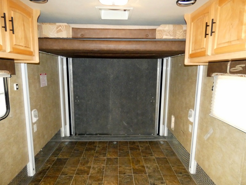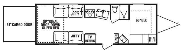 Sportsmen Sportster w/Rear Ramp Door to Cargo Area, Opt. Drop Down Queen Bed, Two Jiffy Sofas, TV/Refrigerator, 3 Burner Range, Double Kitchen Sink, Tub/Shower, Toilet, Sink, Linen Cabinet, Front Queen Bed, Closet, and More.