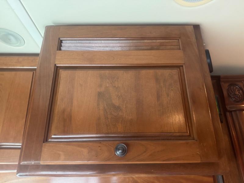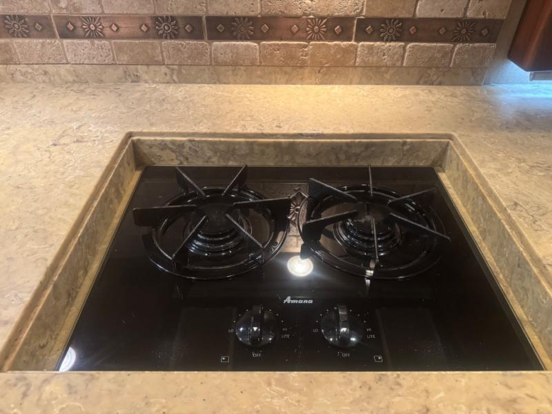 Gourmet Kitchen with solid-surface countertops, a residential refrigerator, convection microwave, 3-burner cooktop, and pull-out pantry, making it easy to cook your favorite meals on the go.