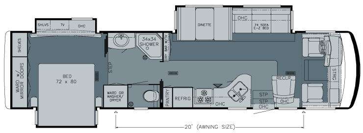 Triple Slide Class A w/Rear King Bed Slide, Wardrobe w/Sliding Mirror Doors, Shelves/TV/Overhead Storage Slide Out, Lav. Angle Shower, Ward. or Washer/Dryer, Private Toilet Area, Pantry, Refrig., 3 Burner Range, Double Kitchen Sink, Recliner, Storage Above Cab Area, Sofa E-Z Bed & Booth Dinette Slide, Dry Bar w/TV, 20' Awning & More! Workhorse Specifications Shown. Ford & Freightliner Also Available.
