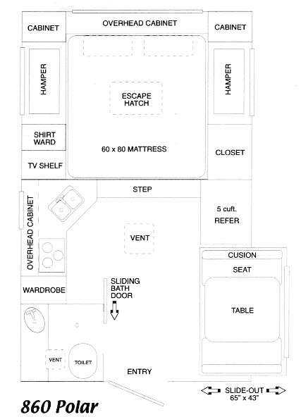 The 860 Polar truck camper by Northland features a single slide and a rear bathroom.