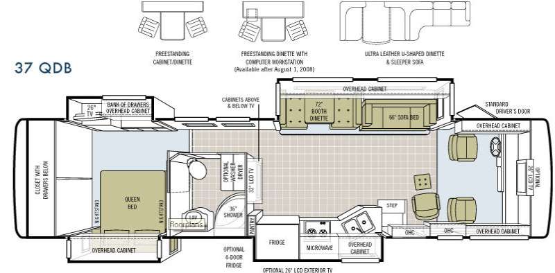 Quad Slide Allegro Bay Diesel Motorcoach w/Queen Bed Slide w/Nightstands & Overhead Cabinet, Closet w/Drawers Below, 26" TV, Bank of Drawers w/Overhead Cabinet Slide, Side Isle Bath w/Angle Shower, Opt. Washer/Dryer, Lav., Toilet, 26" LCD TV, Pantry, Refrig. w/4 Door Opt./2 Burner Range & Double Kitchen Sink Slide, Lounge w/Ottoman, Opt. TV Above Cab Area, Sofa Bed & Booth Dinette or Free Standing Dinette Slide, Standard Drivers Side Door. Freightliner Specs Shown. See us For Workhorse Specs.