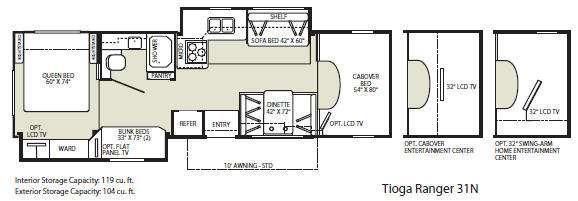 Double Slide Tioga Ranger Class C Motor Home, Rear Queen Bed w/Dbl. Nightstands, Opt. LCD TV/Ward./Bunk Beds & Opt. Flat Panel TV Slide Out, Side Aisle Bath w/Shower, Toilet, Vanity w/Lav., 3 Burner Range w/Micro., Dbl. Kitchen Sink & Sofa Bed Slide Out w/Seatbelts, Refrig., Booth Dinette, Cabover Bed w/Opt. LCD TV or Opt. Cabover Enter. Cntr. w/32" LCD TV or Opt. Swing-Arm Home Ent. Ctr., 10' Awning, Ext. Storage and More.