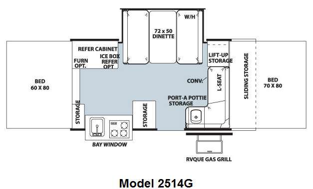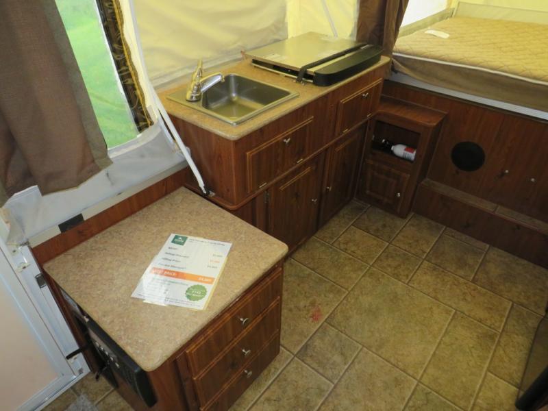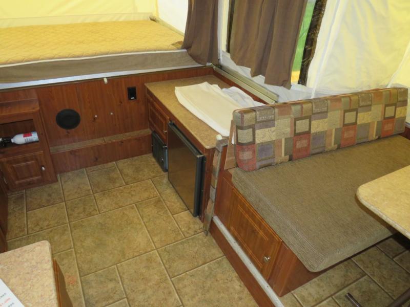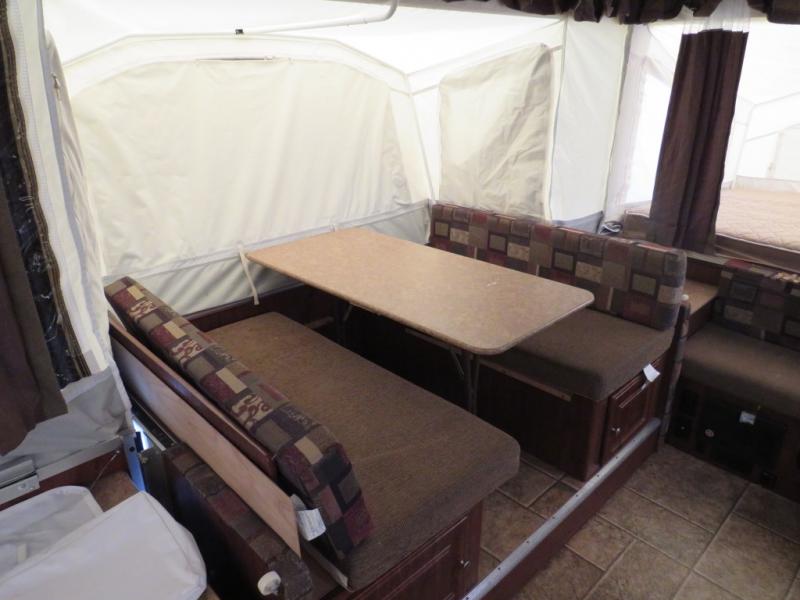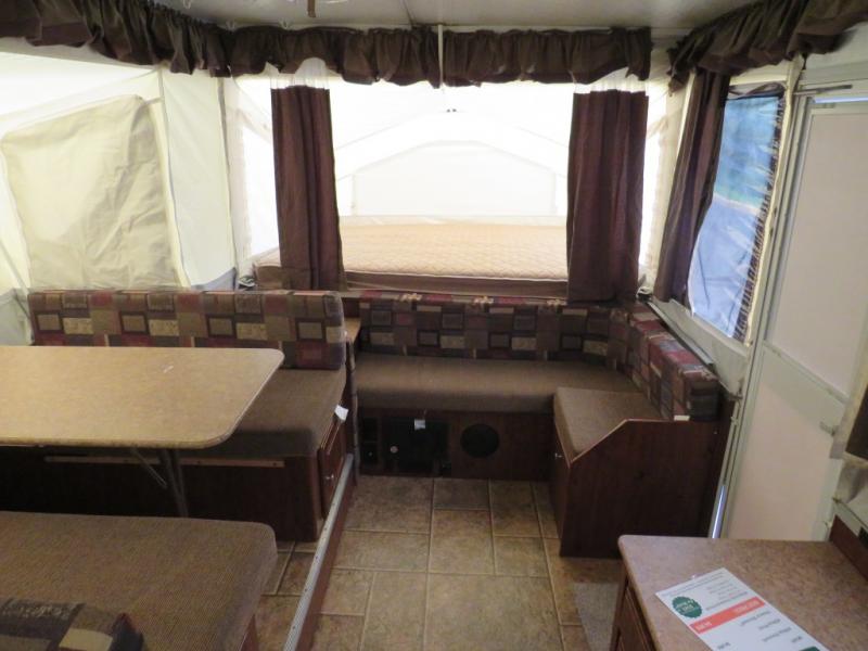 Single Slide Rockwood Premier Pop-Up Camper by Forest River, Rear Queen Tent End Bed and Front King Tent End Bed, Bay Window Over 3 Burner Stove & Sink, Storage Space, Ice Box, Opt. Refrigerator & Furnace, Slide Out Booth Dinette, Port-A-Potty, Life Up Storage Space, Front Sliding Storage, Water Heater, RVQue Gas Grill and More.