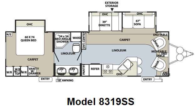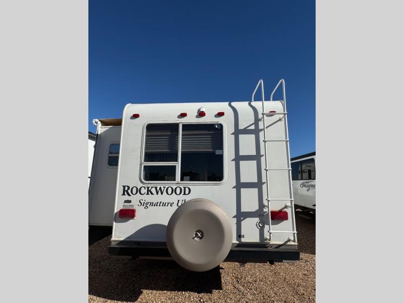 Double Slide Rockwood Signature Series Ultra Lite Travel Trailer w/Rear Queen Bed Slideout, Nightstand, Wardrobes, Vanity, Private Bedroom Entrance, Walk-Thru Bath w/Neo-Angle Shower, Wardrobe, Toilet, Vanity w/Double Sink & Med. Cabinet, Pantry, Refrigerator, 3 Burner Range, Double Kitchen Sink, 2 Bar Stools, Sofa & Booth Dinette Slideout w/Overhead Cabinets, Front Living Area w/2 Chairs & 3 End Tables w/One Moveable, 18' Awning and More!
