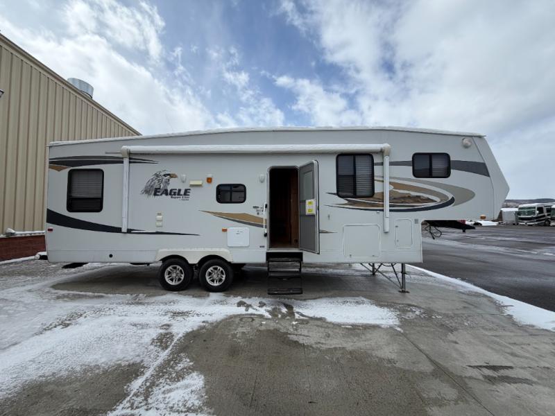 Single Slide Eagle Super Lite Fifth Wheel, Rear Lounge Chairs, Overhead Cab., Ent. Ctr. w/32" LCD TV, J-Steel Sofa & Booth Dinette Slide Out w/Overhead Cab. or Opt. Free Standing Dinette w/Extendable Dinette, Pantry, 3 Burner Range w/Micro., Dbl. Kitchen Sink, Refrig., Ward., Step Up Bath/Bedroom, Corner Shower, Lav. w/Med. Cab., Ward., Toilet, Front Queen Bed w/Dbl. Ward., Overhead Cab., Opt. 18' Awning and More.