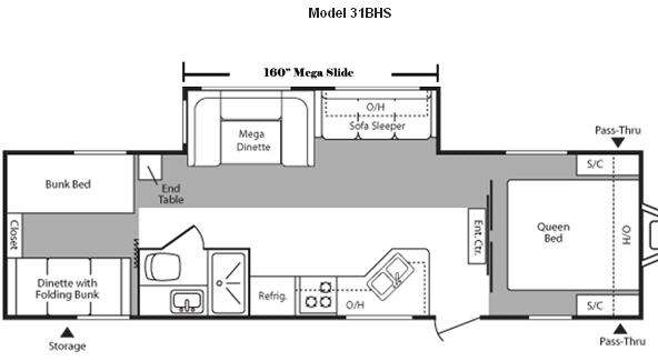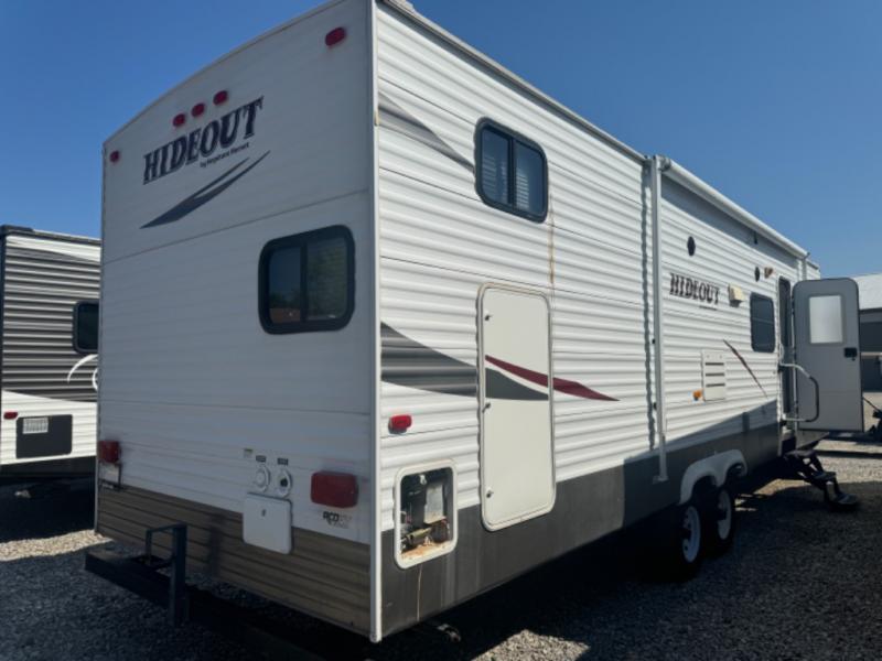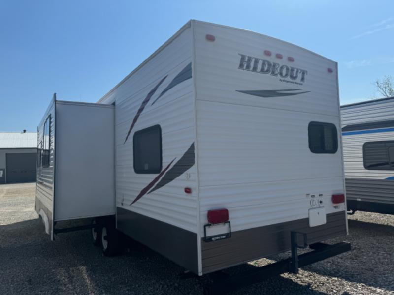 Single Slide Hideout Bunkhouse Travel Trailer w/Rear Bunkhouse Including One Set of Bunks & Dinette w/Folding Bunk Above, Closert & Exterior Storage, Bath w/Sink, Toilet & Tub/Shower, Refrigerator, 3 Burner Range, Dbl. Kitchen Sink, Overhead Cabinet, End Table, Mega Dinette & Sofa Sleeper Slideout, Ent. Center, Front Queen Bed w/Shirt Closets Both Sides, Front Pass-Thru Storage & More!