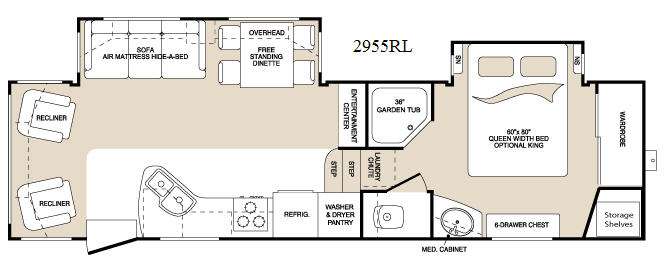 Double Slide Montana Fifth Wheel w/Rear Living Area, 2 Recliners, Sofa Air Mattress Hide-A-Bed/Free Standing Dinette Slideout, Double Kitchen Sink, 3 Burner Range, Refrigerator, Washer/Dryer Pantry, Ent. Center, Laundry Chute, 36" Garden Tub, Private Toilet Area, Sink w/Med. Cabinet, Front Queen Bed Slideout w/Nightstands, Chest of Drawers, Storage Shelves, Wardrobe w/Sliding Doors and Much More!