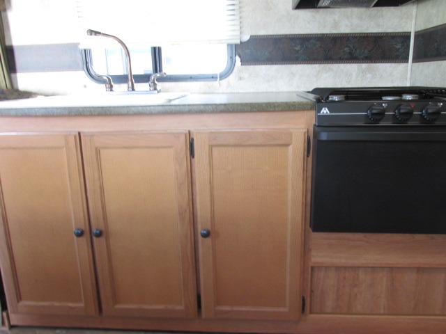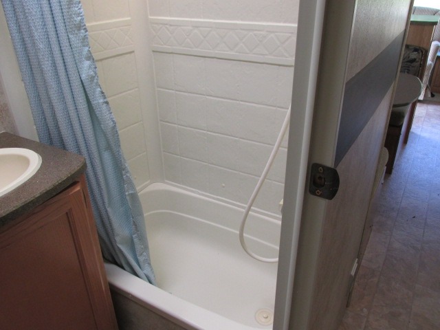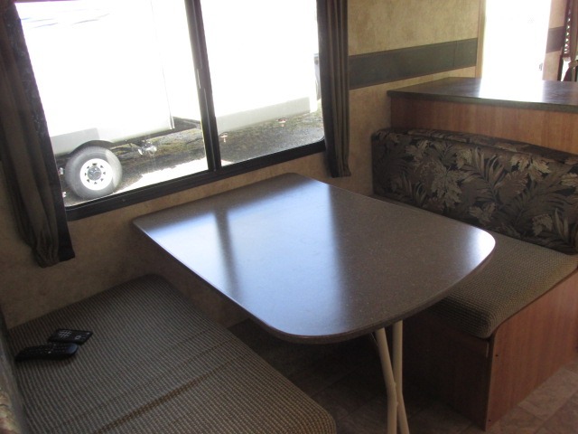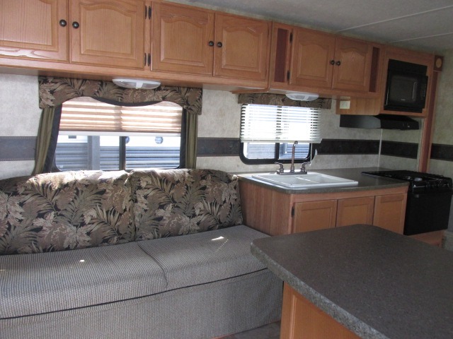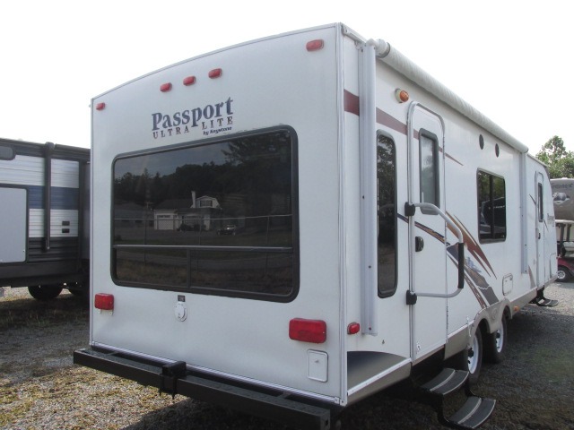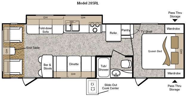 0ingle Slide Passport Trailer by Keystone, Rear Living w/2 Lounge Chairs & End Table, Fold-Down Sofa/Double Kitchen Sink & 3 Burner Range Slide, Refrig., Pantry, Bar w/Stools, Booth Dinette, Overhead Cabinets, Tub/Shower, Vanity & Sink, Front Queen Bed w/Wardrobes, TV Shelf, Private Bedroom Entrance, Pass-Thru Storage, Slideout Cook Center & More.