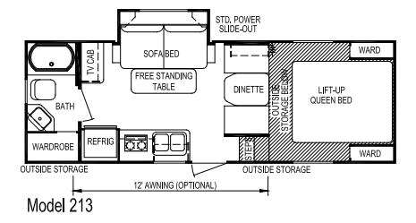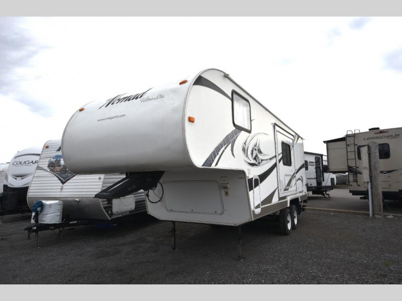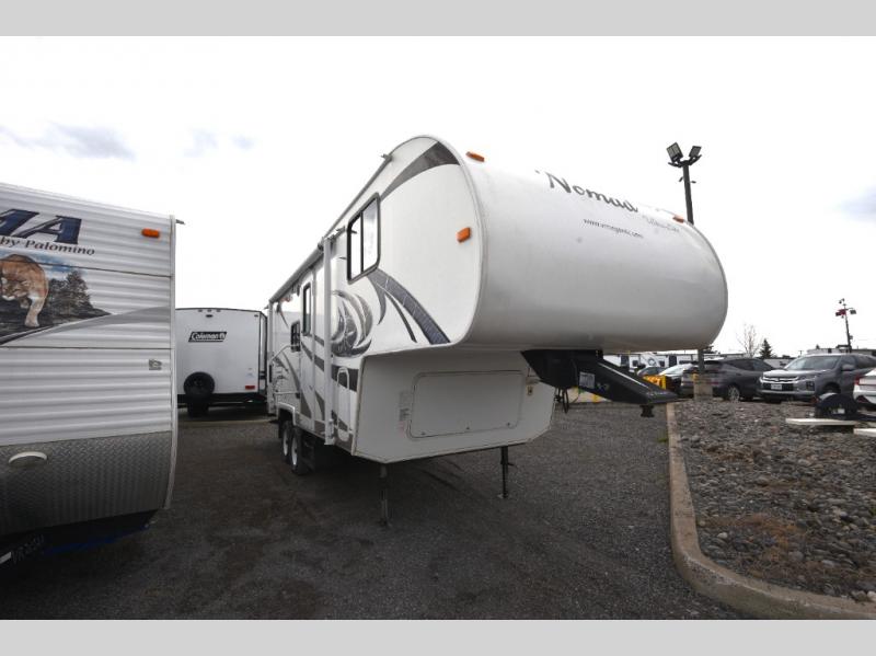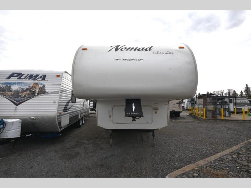 Single Slide Nomad Ultra-Lite Fifth Wheel, Rear Bath w/Shower, Toilet, Lav., Wardrobe, TV Cab., Refrigerator, 2-Burner Range, Double Kitchen Sink, Sofa Bed Slideout, Free Standing Table, Dinette, Lift-Up Queen Bed, Double Wardrobe, Outside Storage, Opt. 12' Awning & Much More!