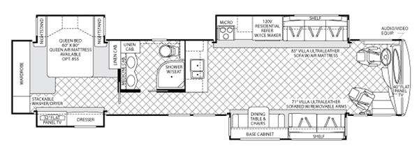 Quad Slide American Tradition Motor Home, Rear Bedroom w/Queen Bed/Nightstands Slide, Ward., Washer/Dryer, 32" Flat Panel TV/Dresser Slide, Linen Cab., Double Lav., Linen Cab., Toilet, Shower w/Seat, Double Kitchen Sink, 3-Burner Range/Microwave/Refrigerator/Sofa/Shelf Slide, 40" Flat Panel TV, Sofa/Shelf/Dining Table & Chairs/Base Cab. Slide, Overhead Cabinets Throughout & Much More. Available Options May Include: Queen Air Mattress.