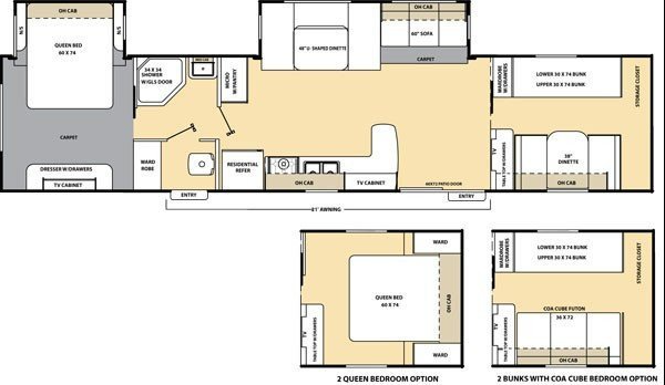 Catalina Deluxe Edition Destination Model w/Rear 32" Dinette w/Overhead, TV/Tabletop Ward. w/Drawers, Bunk Beds, Ward. w/Drawers, Rear Ext. Storage, Pantry, Res. Refrig., Range w/Micro. Above, Kitchen Sink, Overhead Storage, Booth Dinette & 70" Sofa Slide, Ent. Center, Patio Door, Angle Shower, Linen Cab., Toilet, Sink w/Med. Cab., Closet w/Shelf, Front Queen Bed w/Nightstands, Ent. Center, Ward. w/Drawers, Private Entry & More! Avail. Options May Include: Wash/Dryer Prep, Ceiling Fans, Dinette.