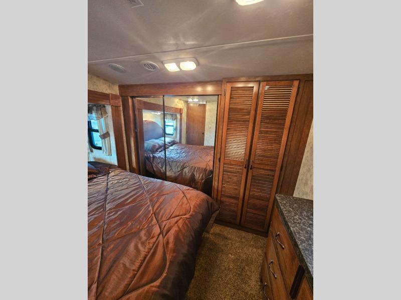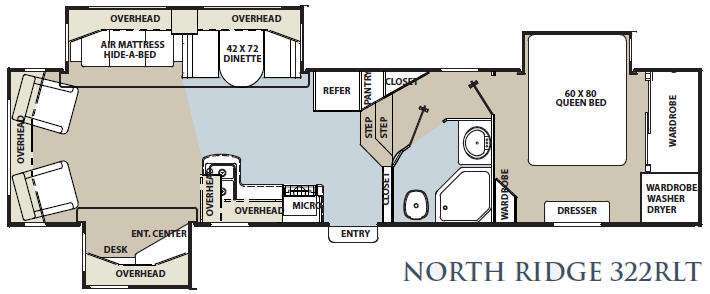 Triple Slide North Ridge FW by Coachmen RV w/Rear Living Area Including 2 Lounge Chairs, Overhead Cabinets, Slideout Desk/Ent. Center w/Overhead Cabinet, Slideout Air Mattress & Booth Dinette, L-Shaped Counter w/Dbl. Kitchen Sink, 3 Burner Range w/Micro. & Overhead Cabinets, Coat Closet, Refrigerator, Step Up to Side Aisle Bath w/Angle Shower, Toilet & Sink, Hall Closet, Front Queen Bed Slide, Dresser, Ward./Washer/Dryer, Wardrobe w/Sliding Doors, Corner Wardrobe and More!