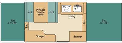 Destiny Folding Pop-Up Camper by Coleman, Rear & Front Tent End Beds, Booth Dinette, Portable Dinette Table, Storage, Galley w/2 Burner Range, Single Kitchen Sink, Storage, Front & Rear Bed Steps & More.