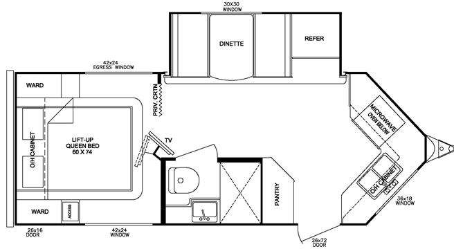 Single Slide ViewFinder V-Nose Trailer by Cruiser RV with Rear Lift-Up Queen Bed, Overhead Cab., Dbl. Wardrobes, Access, Rigid Folding Privacy Curtain, Side Aisle Bath w/Tub, Toilet, Vanity w/Sink, Booth Dinette & Refrig. Slideout, Pantry, Front V-Nose Kitchen w/Dbl. Kitchen Sink, 3 Burner Range & More. Available Options May Include: Convection Microwave.