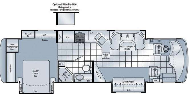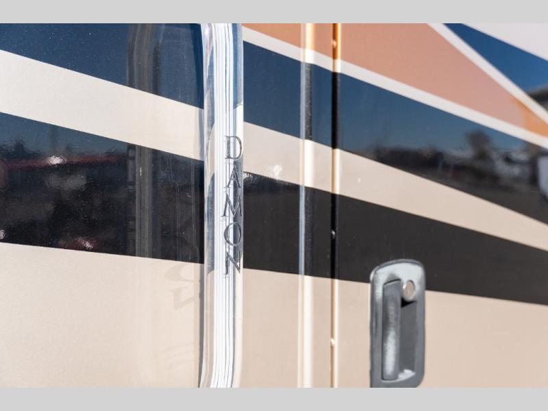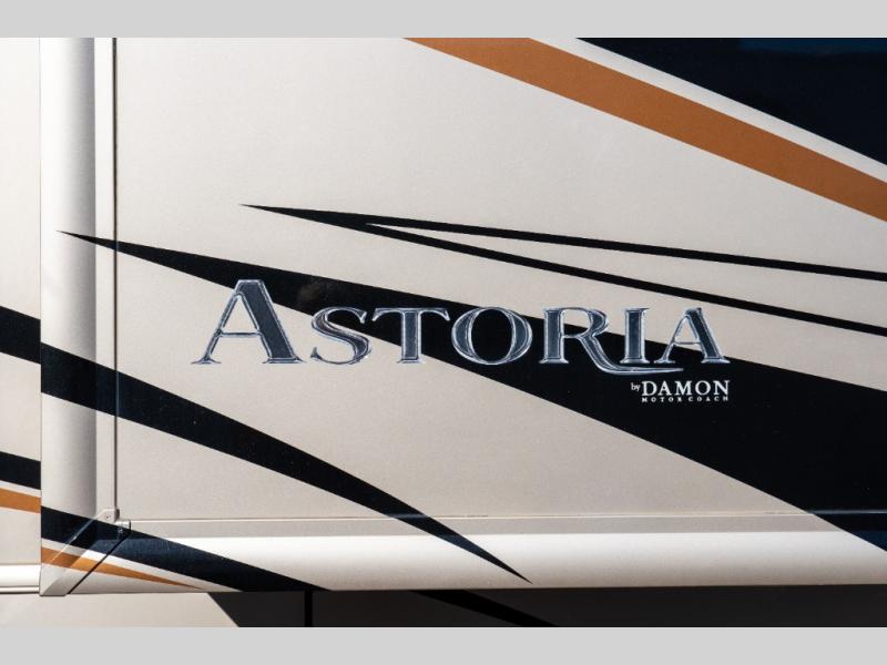 Damon Astoria Class A Diesel Coach w/Rear Queen Bed Slide w/Nightstands, Overhead Cabinet, Wardrobe & Linen/Washer/Dryer Prep Cabinet, 19" LCD TV/Dresser/Pantry/Refrigerator/3 Burner Range/Microwave/Dbl. Kitchen Sink & 82" U-Shaped Dinette Full Wall Driver's Side Slide, Overhead Storage Above Cab, 72" Sofa Air Bed Slideout, 42" LCD TV, Bath w/Angle Shower, Toilet, Linen Cabinet & Sink and Much More! Available Options May Include: Side-by-Side Refrigerator IPO Pantry/Refrig. on Full Wall Slide.