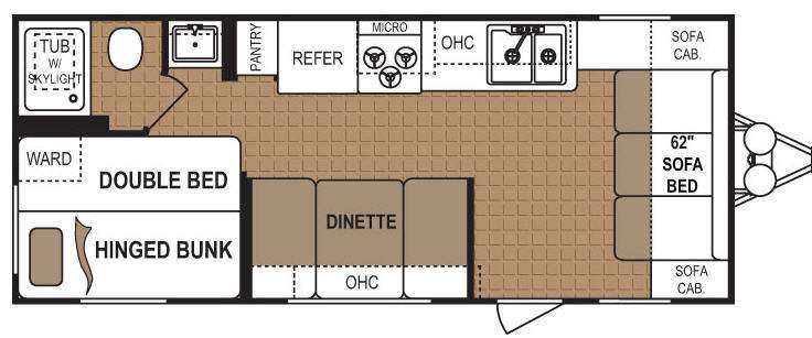 Dutchmen Sport Travel Trailer w/Rear Corner Bath w/Tub Shower & Skylight, Toilet, Separate Sink, Rear Corner Double Bed w/Hinged Bunk Above, Wardrobe, Pantry, Refrigerator, 3 Burner Range w/Microwave Above, Double Kitchen Sink, Booth Dinette w/Overhead Storage Cabinets, Front Sofa Bed w/Storage Cabinets & Side Sofa Cabinets & More.