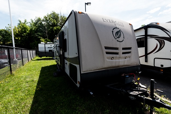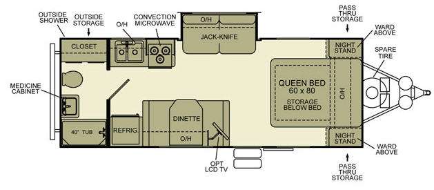 Single Slide Ever-Lite Travel Trailer by EverGreen, Rear Tub, Closet, Lav. w/Med. Cab., Toilet, Storage, Refrig., Dbl. Kitchen Sink, 3 Burner Range, Micro., Overhead Cab., Booth Dinette, Overhead Cab., TV Shelf, Jack-Knife Slide Out, Front Queen Bed w/Storage Below Bed, Dbl. Nightstands, Pass Thru Storage, Wardrobes, Ext. Aux. Shower & More.