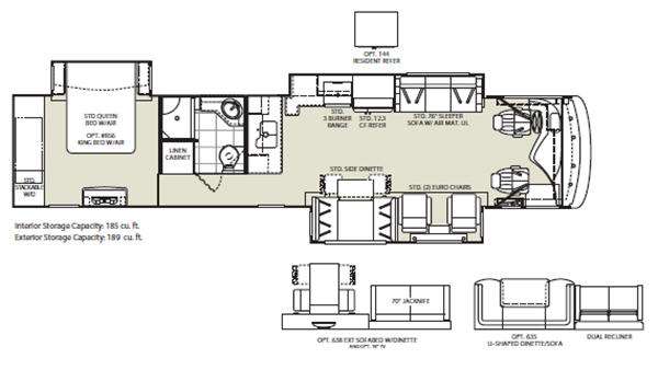 Triple Slide Discovery Motor Home, Rear Wardrobe w/Stackable Washer/Dryer, Queen Bed w/Nightstands Slideout, Dresser, Linen Cabinet, Shower, Lav., Toilet, Double Kitchen Sink, 3-Burner Range/Refrigerator/Sofa w/Air Mattress Slideout, Dinette/2 Euro Chairs Slideout & Much More. Available Options May Include: King Bed, Sofa/Dinette Slideout, U-Shaped Dinette/Dual Recliner Slideout, Residential Refrigerator.