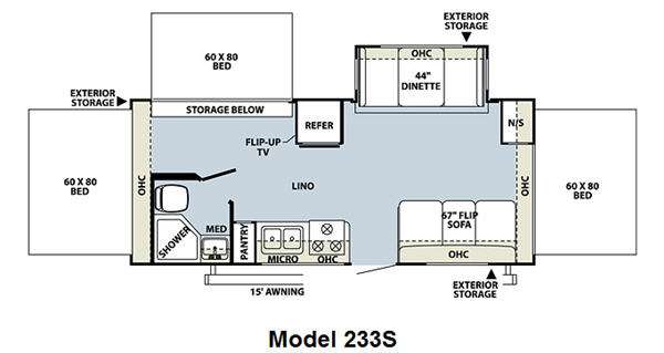 Single Slide Shamrock Travel Trailer w/3 Queen Tent Beds, Exterior Storage, Storage Below Side Tent Bed, Angle Shower, Lav., Med. Cabinet, Toilet, Pantry, Double Kitchen Sink, 3 Burner Range, Micro., 67" Flip Sofa, 15' Awning, Booth Dinette & Overhead Storage Slide, Nightstand, Refrigerator, Ext. Storage, 15' Awning & More!