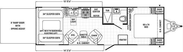 Palomino Puma Unleashed Toy Hauler w/Rear 8' Ramp Door w/Spring Assist to 13'6" Up to 14'4" Cargo Area, 2 Sleeper Sofas in Cargo Area w/Table Between, 2 Lounge Chairs w/Dinette Table Between, Dbl. Kitchen Sink, 3 Burner Range, Ent. Center/Refrigerator, Pantry, Tub/Shower, Toilet & Vanity w/Sink, Front Queen Bed w/Nightstand/Shirt Closet, TV Shelf, Exterior Storage & More! Available Options May Include: Electric Queen Lift Bed in Cargo.