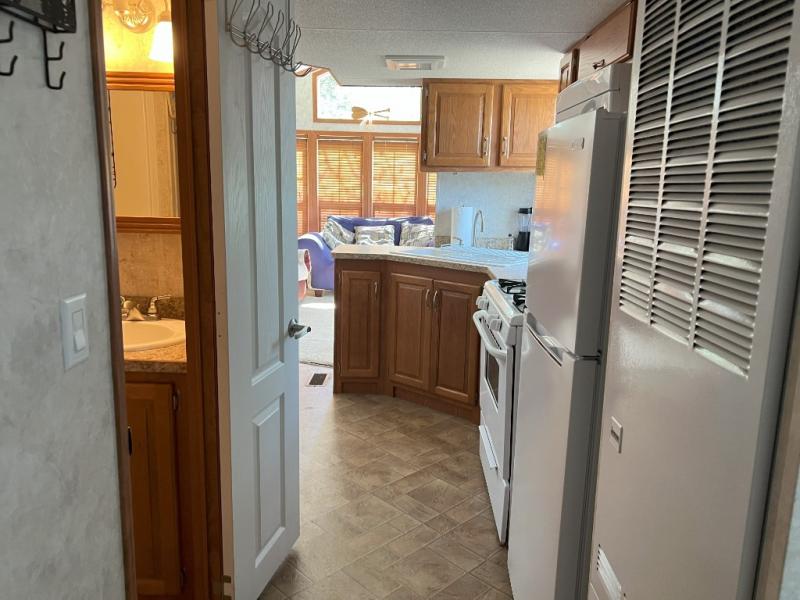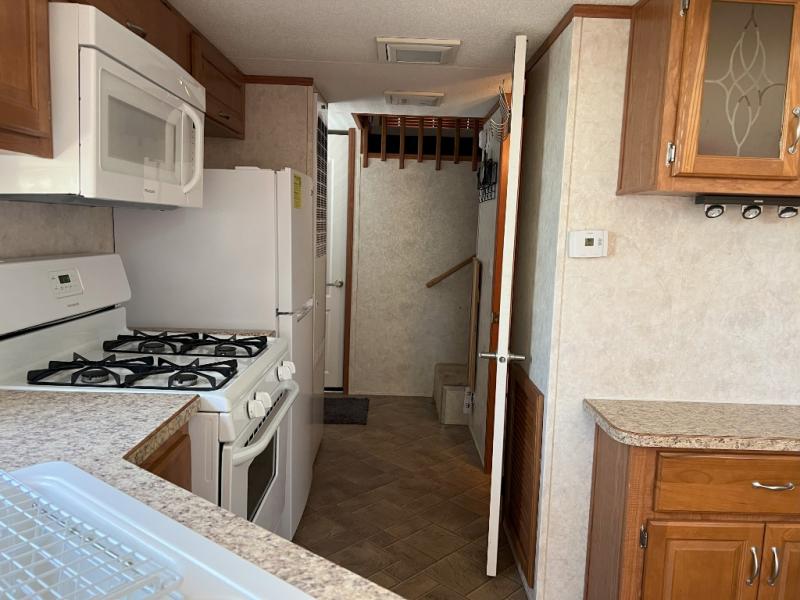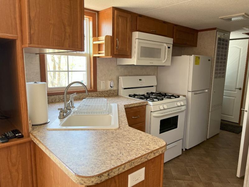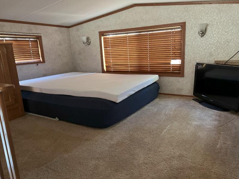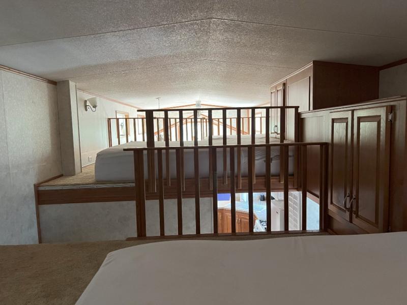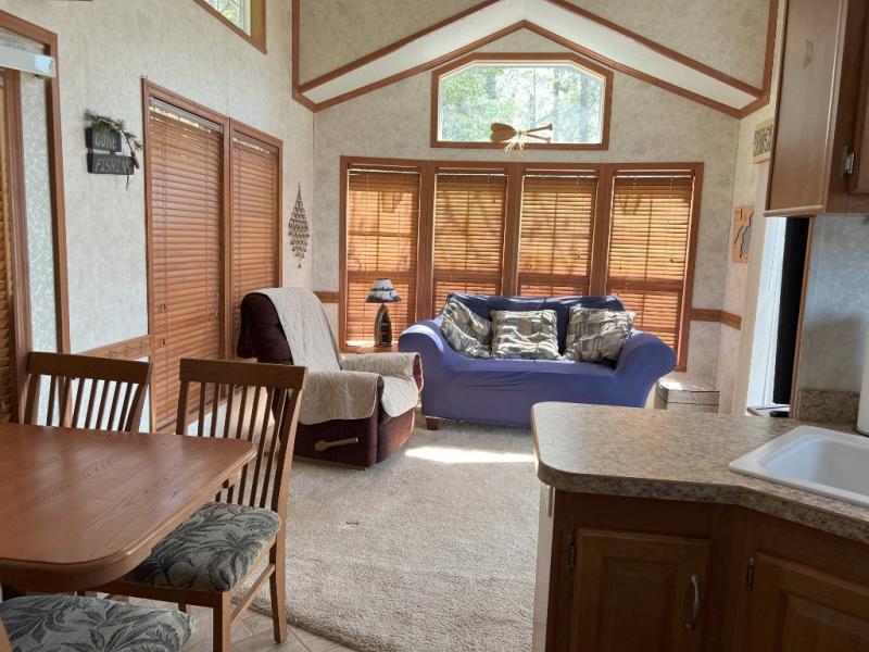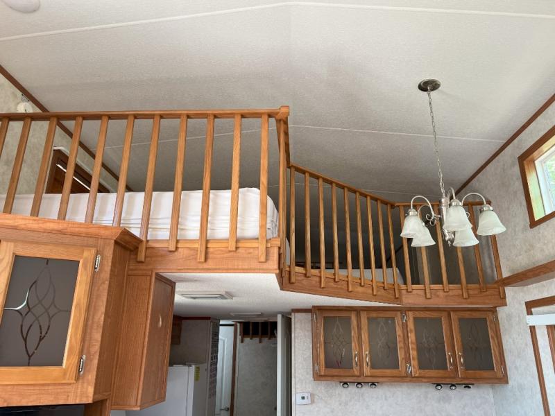As you enter the front of this park model through the sliding glass door, you will fine a loveseat and recliner chair. There is an entertainment center with a TV and electric fireplace. There is a table with 4 chairs and a hutch on one side and a the kitchen with a double kitchen sink, residential refrigerator, 4-burner range and microwave on the other side. As you make your way to the middle of the park model, you will find the residential bath with toilet, linen closet, tub w/shower and vanity sink. In the rear of the park model is a step down queen bedroom with closets, chest of drawers and TV shelf. There is 2 lofts above the bedroom, bath and kitchen. This park model has ducted AC and furnace, side entry door and much more.