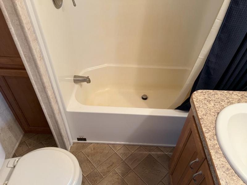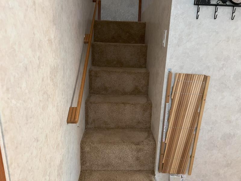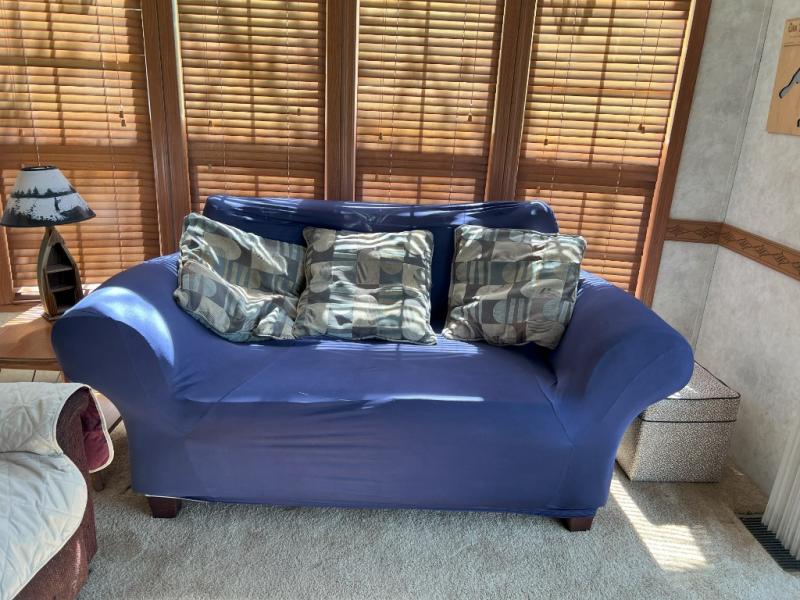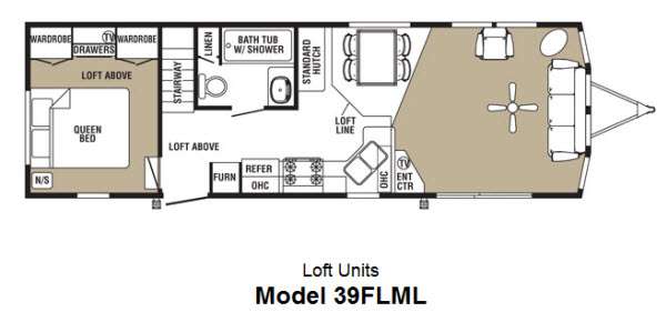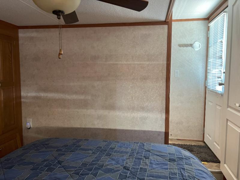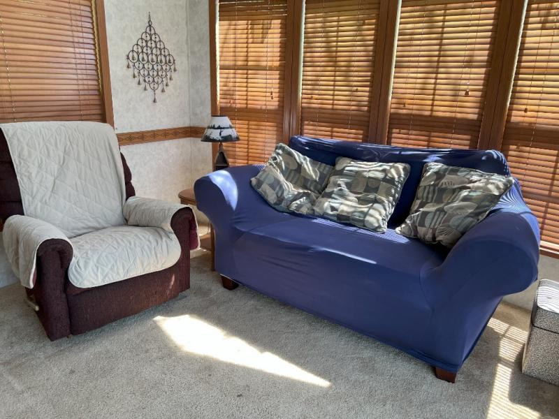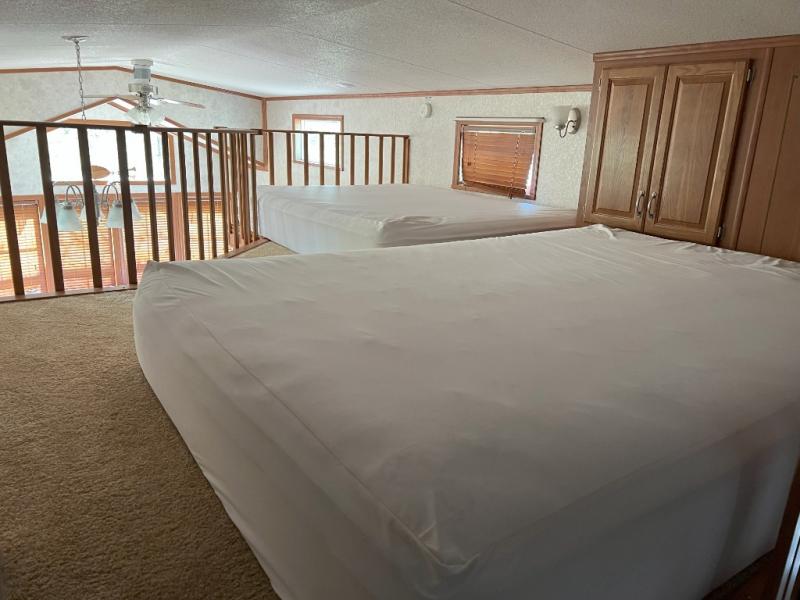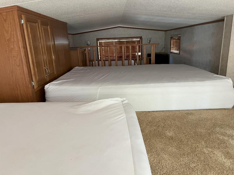 As you enter the front of this park model through the sliding glass door, you will fine a loveseat and recliner chair. There is an entertainment center with a TV and electric fireplace. There is a table with 4 chairs and a hutch on one side and a the kitchen with a double kitchen sink, residential refrigerator, 4-burner range and microwave on the other side. As you make your way to the middle of the park model, you will find the residential bath with toilet, linen closet, tub w/shower and vanity sink. In the rear of the park model is a step down queen bedroom with closets, chest of drawers and TV shelf. There is 2 lofts above the bedroom, bath and kitchen. This park model has ducted AC and furnace, side entry door and much more.