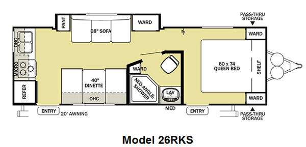 Single Slide Salem Cruise Lite Travel Trailer, Rear Kitchen w/Refrigerator, 3-Burner Range, Microwave, Double Kitchen Sink, Pantry/Sofa/Wardrobe Slide, Dinette, Ward., Toilet, Neo-Angle Shower, Lav., Med. Cab., Queen Bed w/Shelf Above, Double Wardrobes, Pass Thru Storage, Overhead Cabinets Throughout, 20' Awning & Much More.