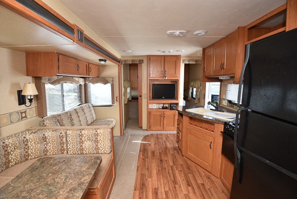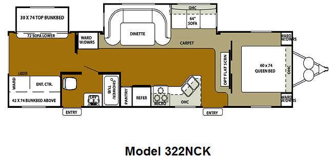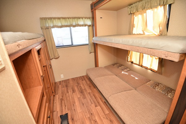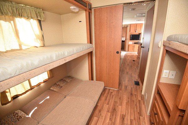 Double Slide Wildwood DLX Destination Trailer, Bunk Bed w/Sofa Below Slide Out, Bunk Bed w/Ent. Ctr. & Ward., Bunk Ladder, Tub/Shower, Toilet, Lav., Med. Cab., Refrig., Dbl. Kitchen Sink, 3 Burner Range, Micro., Pantry, Ward. w/Drawers, U-Shaped Dinette & Sofa Slide Out, Overhead Cab. Throughout, Opt. Flatscreen, Front Queen Bed, Ward. w/Drawers & More.