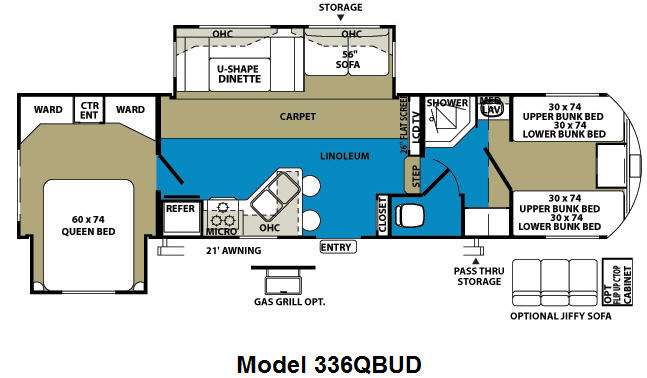 Double Slide Heritage Glen Fifth Wheel by Forest River, Rear Queen Bed Slide, Dbl. Ward., Ctr. Ent., Refrig., 3 Burner Range, Micro., Dbl. Kit. Sink, Bar Stools, U-Shape Dinette & Sofa Slide, Storage, Closet, 26" LCD TV, Private Toilet Area, Corner Shower, Lav., Med. Cab., Front Bunkhouse w/Quad Bunks, Ward, 21' Awning & More. Available Options May Include: Jiffy Sofa IPO Bunk Beds, Flip Up C-Top Cabinet, Gas Grill.