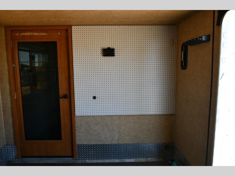 Rear ramp door leading to a 12' cargo garage, ideal for motorcycles, ATVs, or gear