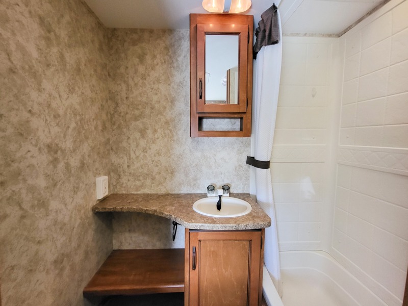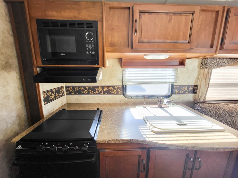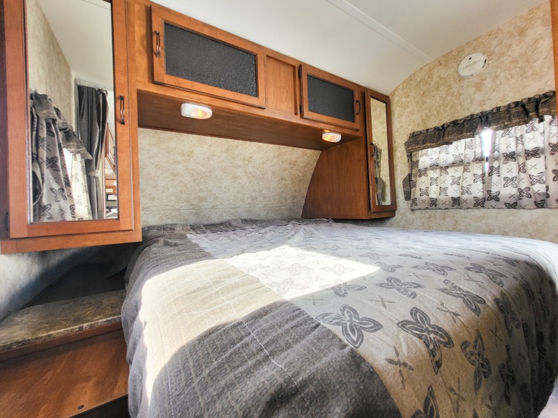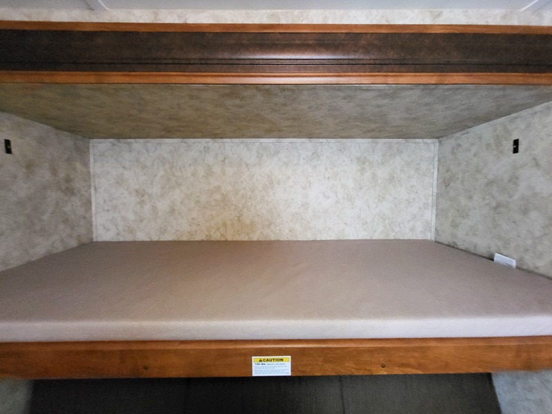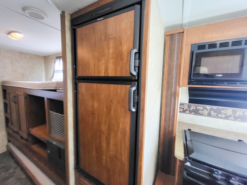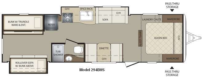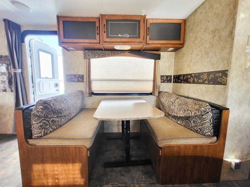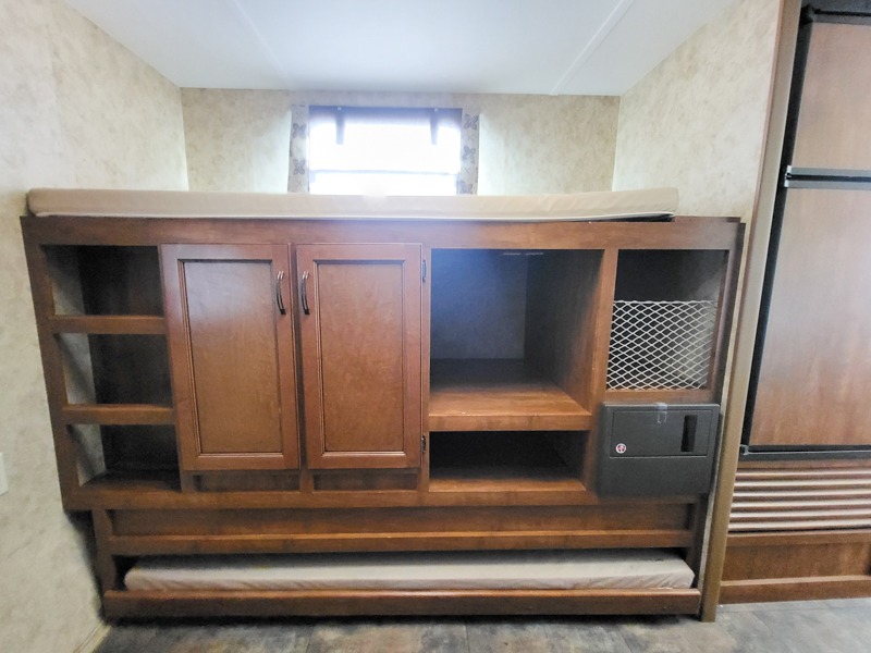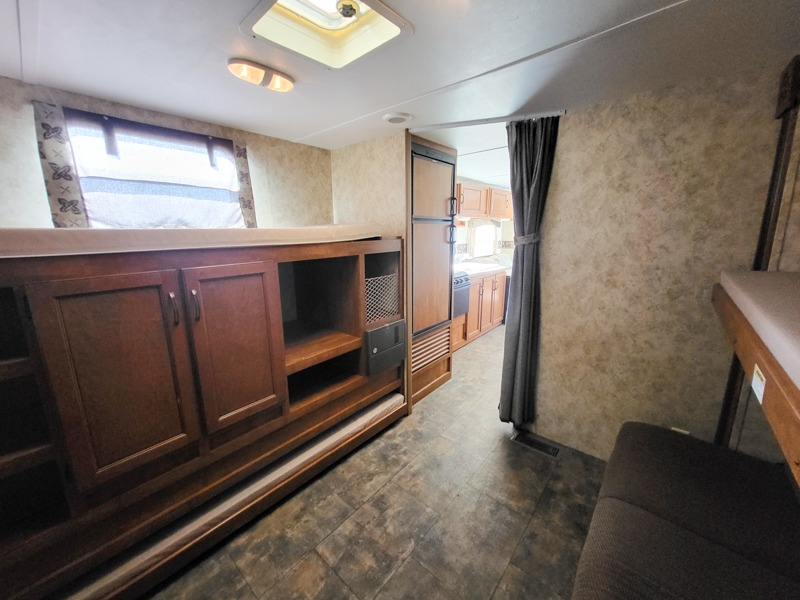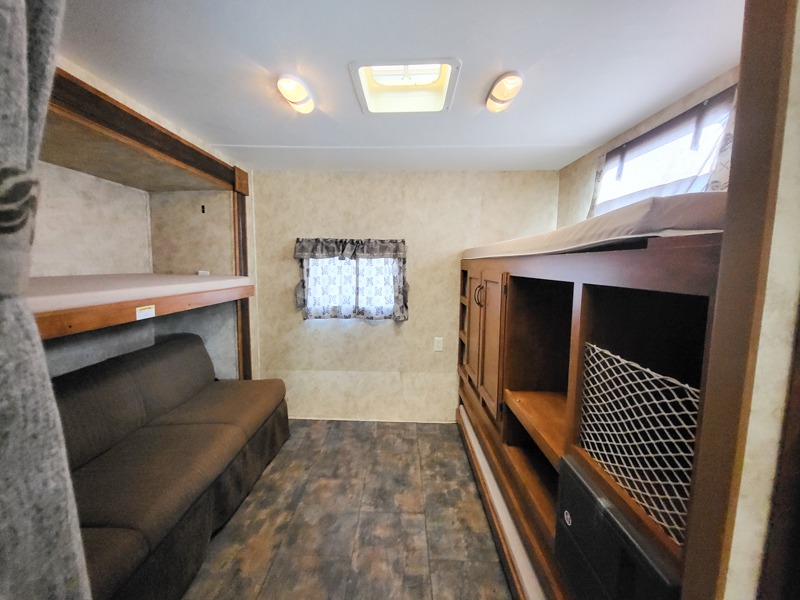 Bullet Bunkhouse Travel Trailer by Keystone RV w/Rear Rollover Sofa w/Bunk Above Slide, Bunk w/Trundle/Wardrobe & Ent. Center, Refrigerator, 3 Burner Range/Kitchen Sink & Sofa Slideout, Swivel LCD TV in Living Area/Bedroom, Booth Dinette, Tub/Shower, Vanity w/Sink & Toilet, Front Queen Bed w/Wardrobes Both Sides of Bed, Laundry Chute, Front Pass-Thru Storage and More!