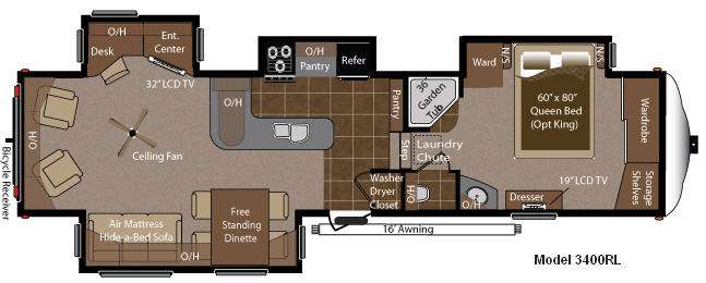Montana FW w/Rear Living Area w/2 Recliners, Overhead Storage, Slideout Desk & Ent. Center w/Overhead Cab., Sofa w/Air Mattress Hide-A-Bed & Free Standing Dinette Slide, L-Shaped Counter w/Dbl. Kitchen Sink, 3 Burner Range/Pantry & Refrig. Slide, 2nd Pantry, Washer or Entry Closet, Step Up to Bed & Bath w/Laundry Chute, 36" Angle Garden Tub, Private Toilet Area, Sink w/Med. Cabinet, Front Queen Slide w/Nightstands, 6 Drawer Chest, Ward. w/Sliding Doors, Shelves & More! Big Sky Package Eligible