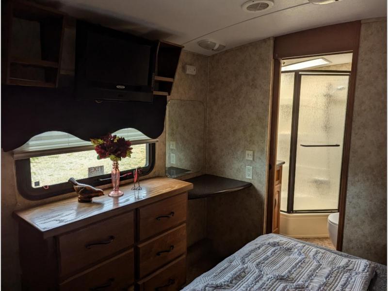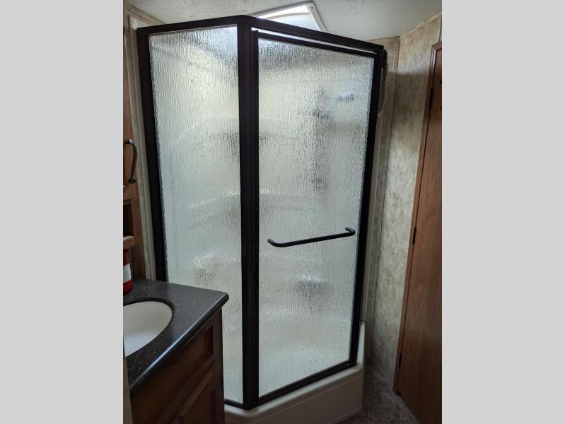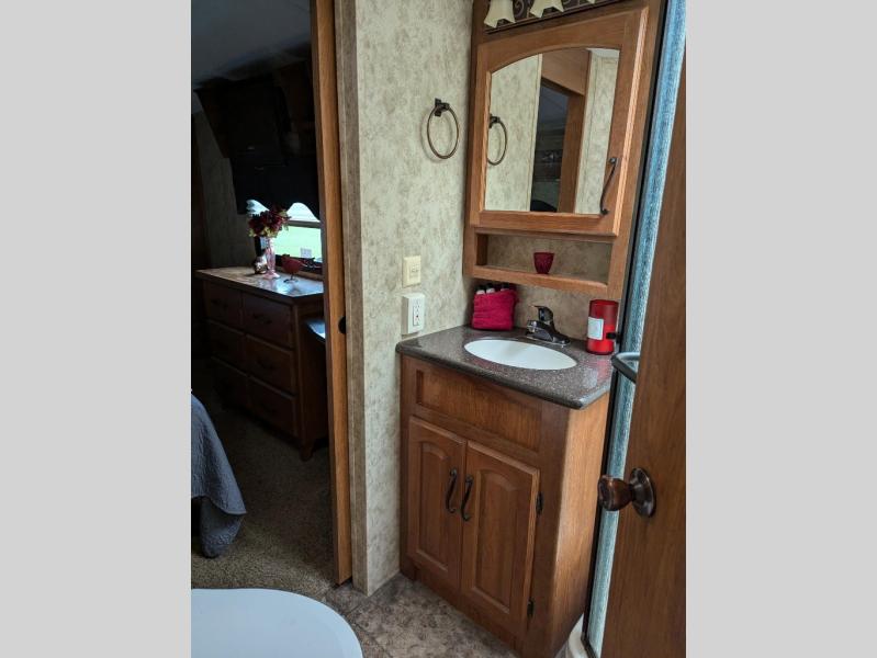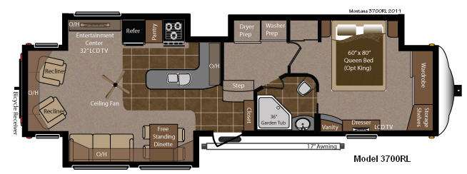 Keystone Montana FW w/Rear Living Area Including 2 Recliners, Overhead Cabinet, Ent. Center w/32" LCD TV/Refrig./Pantry & 3 Burner Range Slideout, Sofa & Free Standing Dinette Slide, L-Counter w/Dbl. Kitchen Sink & Overhead Cabinet Storage, Step Up to Side Aisle Bath w/Garden Tub, Toilet & Sink, Dryer Prep/Washer Prep/Closet/Nightstand & Queen Bed Slide, Wardrobe w/Sliding Door, Storage Shelves, Dresser, LCD TV, Vanity, Dbl. Bath Entry and More! Available Options May Include: King Bed.