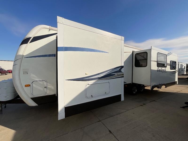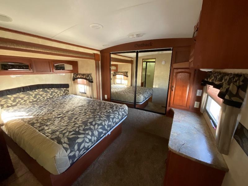 Keystone Outback Travel Trailer w/Rear Living Area Including 2 Lounge Chairs w/End Table Between & Overhead Cabinet, Air Sofa Sleeper & King Dinette Slide, LCD TV, Dbl. Kitchen Sink, 3 Burner Range, Refrigerator, Pantry, Linen Cabinet, Outside Camp Kitchen, Side Aisle Bath w/Angle Shower, Toilet & Sink, Dbl. Bath Entry, Front Queen Bed Slide w/Overhead Cabinet, Pass-Thru Storage, Full Front Wall Wardrobe, Dresser, TV and Much More!