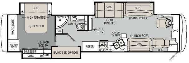 Triple Slide Knight Motor Home, Rear Washer/Dryer, Wardrobe, Queen Bed/Nightstands Slide, Linen, Shower, Vanity, Toilet, 40" LCD TV, Booth Dinette/Sofa Slide, Sofa, Flip-Up Counter, Double Kitchen Sink, 2-Burner Range, Microwave, Refrigerator, 26" LCD TV/Dresser Slide, Overhead Cabinets Throughout & Much More. Available Options May Include: Bunk Beds.