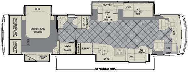 Extras: Automatic leveling, power awning, climate control, washer/dryer combo, generator, and pass-through basement storage.