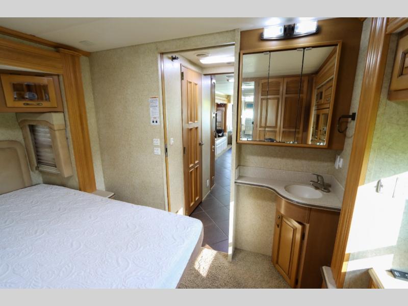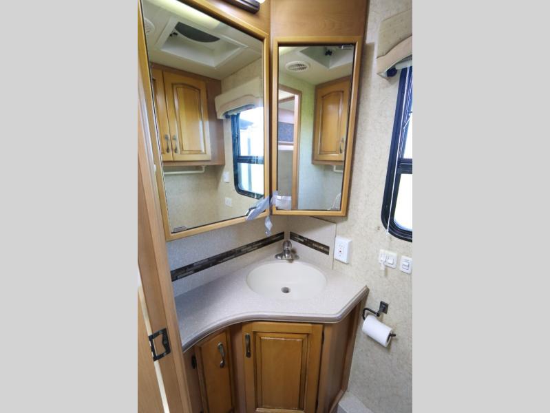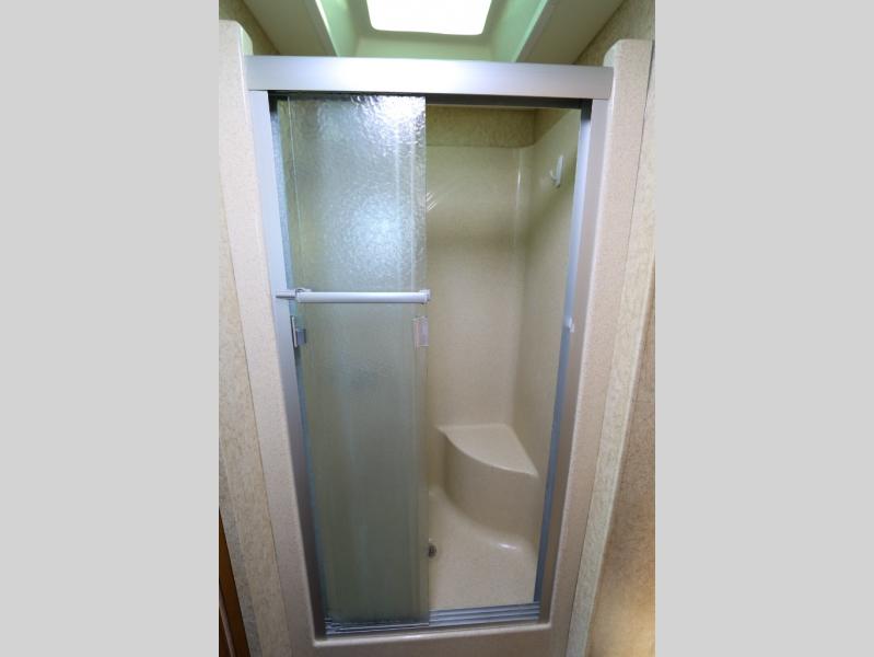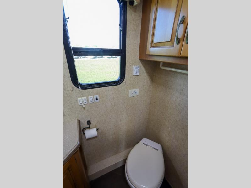 Bathroom: Large shower, vanity, and porcelain toilet for at-home convenience on the road.