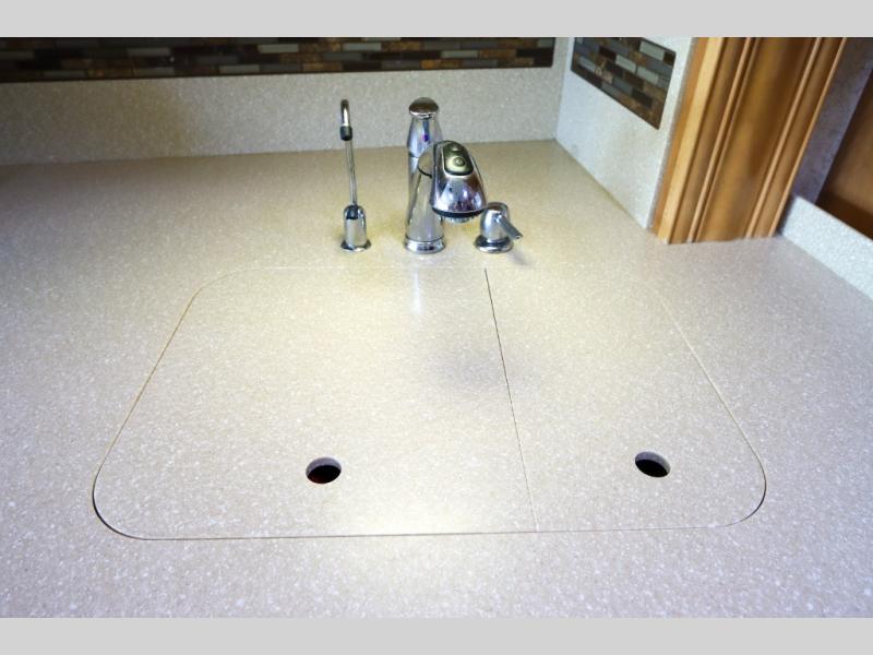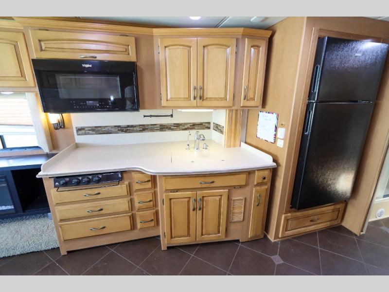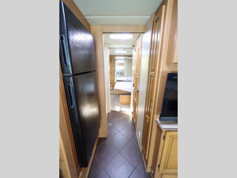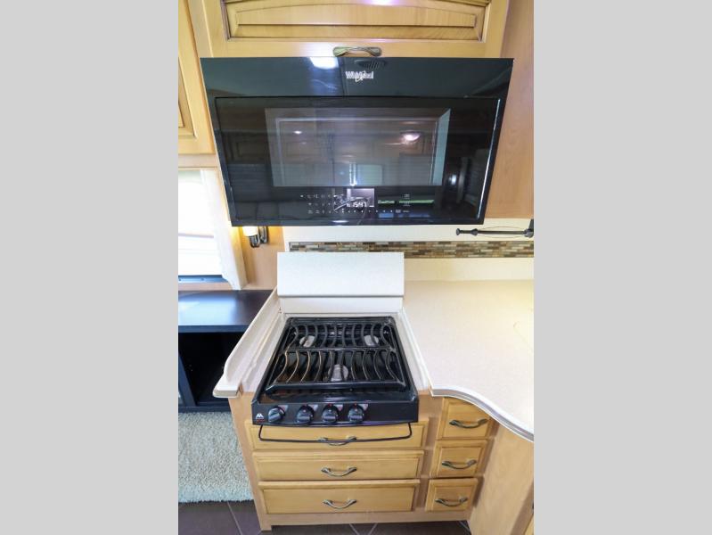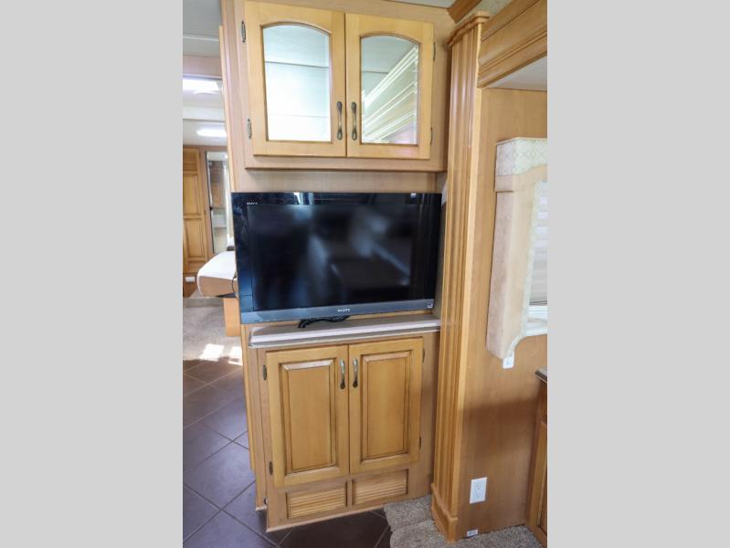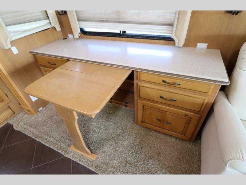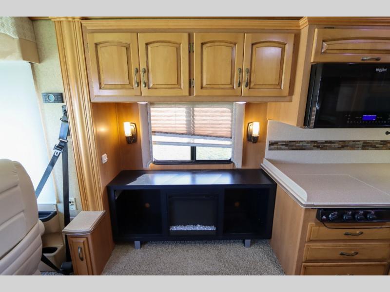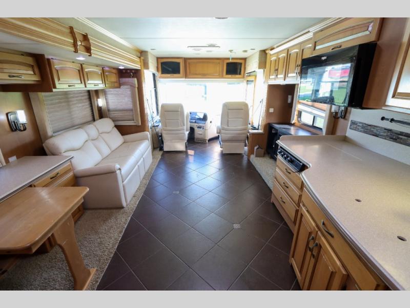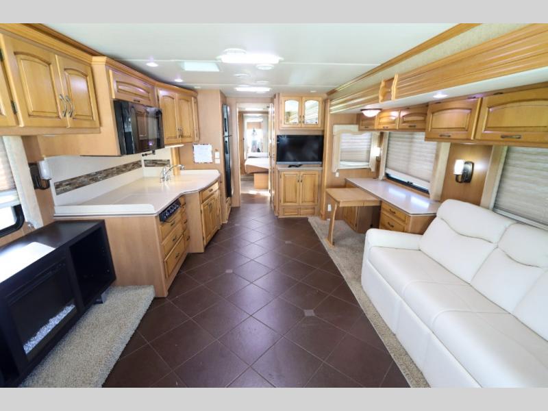 Interior Comfort: Four slide-outs open to a spacious and thoughtfully designed interior with rich wood cabinetry, solid-surface countertops, and premium finishes.