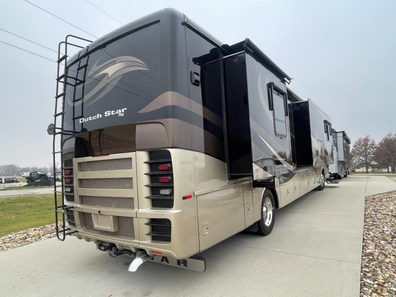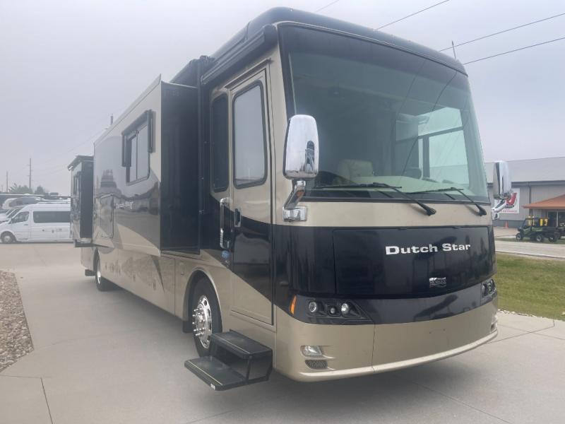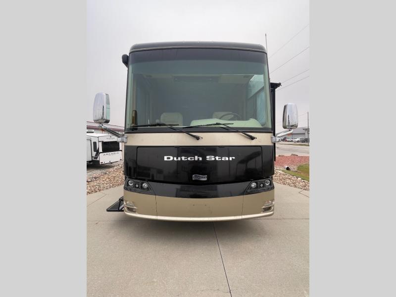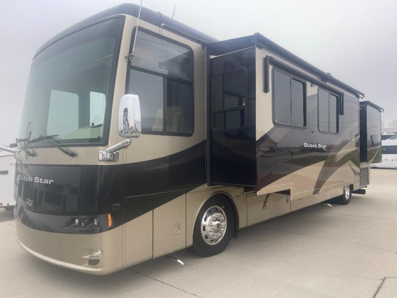 Quad Slide Dutch Star Class A Diesel w/Rear King Bed Slide, Wardrobe w/Sliding Mirror Doors, Ward. or Washer/Dryer, TV/Dresser Slideout, Shower, Lav., Toilet, Lav., Pantry, Dbl. Pantry/Refrigerator/Hide-A-Leaf Dinette/Buffet/Easy Bed Sofa Slide, Overhead Cabinet Above Cab Area, Easy Bed Sofa/Pull Out Cabinet/3 Burner Range & Double Kitchen Sink Slide, 21' Awning and Much More.