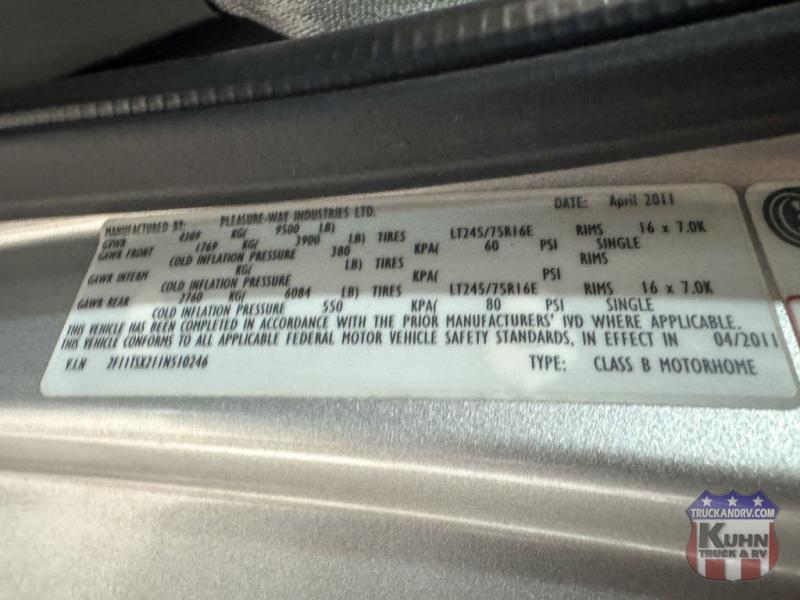 2011 Pleasure-Way Excel-TS - 20.5' bumper to bumper - Sleeps 2-3 - Ford E350 van chassis - Gas 5.4L V8 engine - Tow package - Onan 2800 gasoline generator with 101 hours - 4 seatbelts - Flat screen TV - Microwave/convection oven - 12V Isotherm Fridge/Freezer - Coolcat rooftop A/C and heat pump - Propane furnace - Wet bath - 1 coach battery - Power windows, locks, and mirrors - Tilt, cruise, CD player - Hit the road today in this Pleasure-Way!