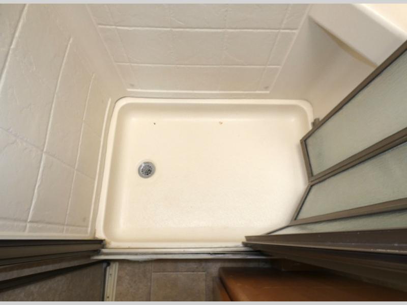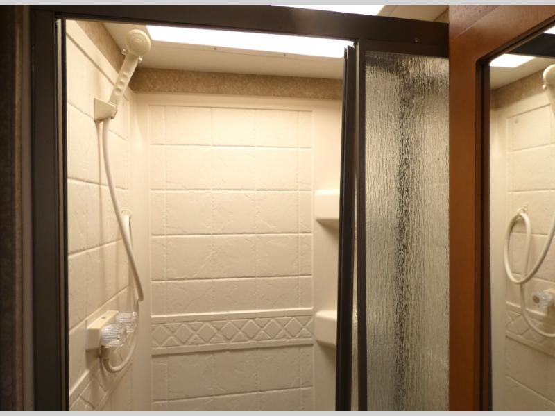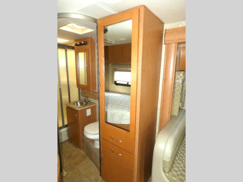 In the rear of the Siesta Sprinter 24SA you will find a corner bathroom including a shower, vanity sink, medicine cabinet, and a toilet. There is a closet just outside the bath. .
