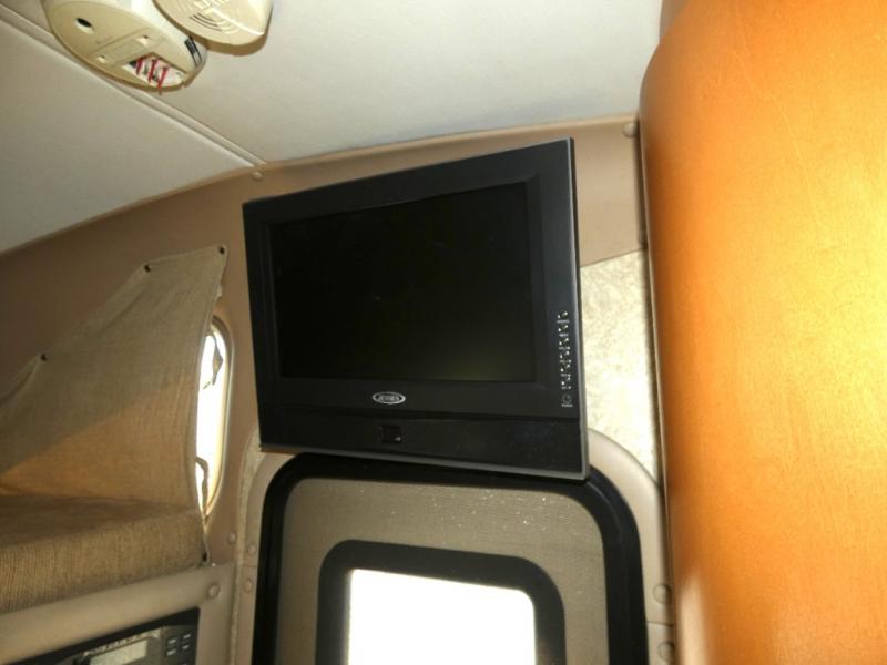 A 24" LED TV is mounted over the entry door. To the left of the door, the kitchen features a single round sink, overhead cabinets, a two burner range top, overhead microwave, and a refrigerator.